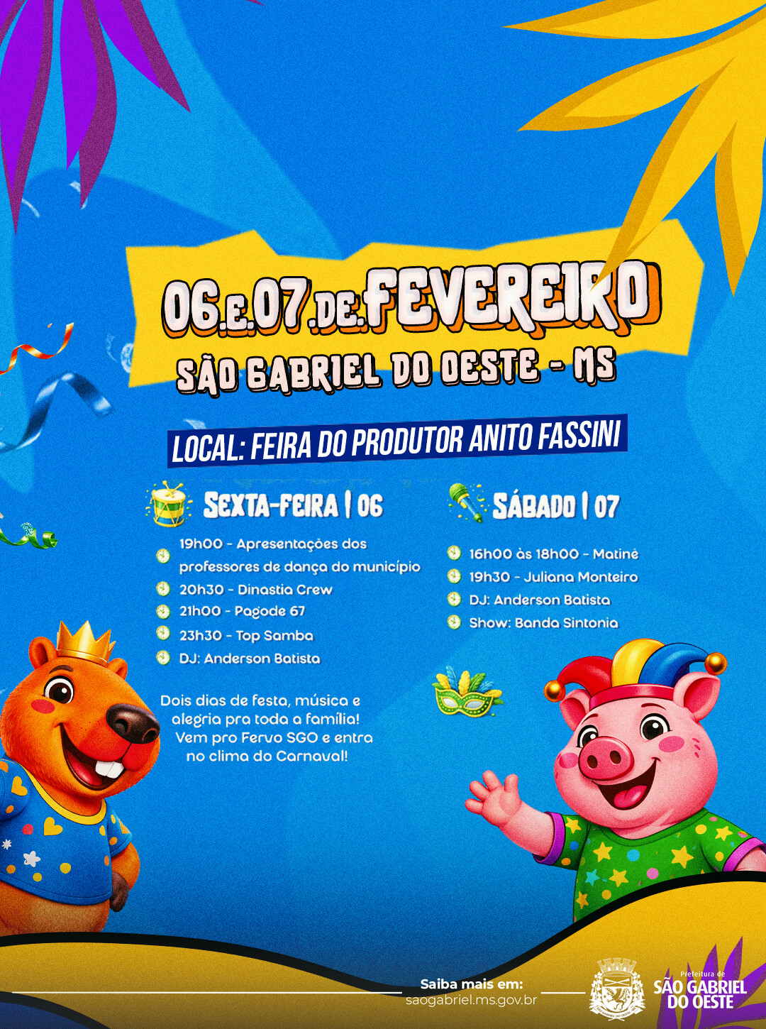 O Carnaval começa hoje em São Gabriel do Oeste e chega com uma proposta inédita, que une festa, cultura, economia local e solidariedade. Pela primeira vez, o município realiza o Grito de Carnaval, ampliando as opções de lazer para a população e fortalecendo o comércio local, especialmente nos bairros.